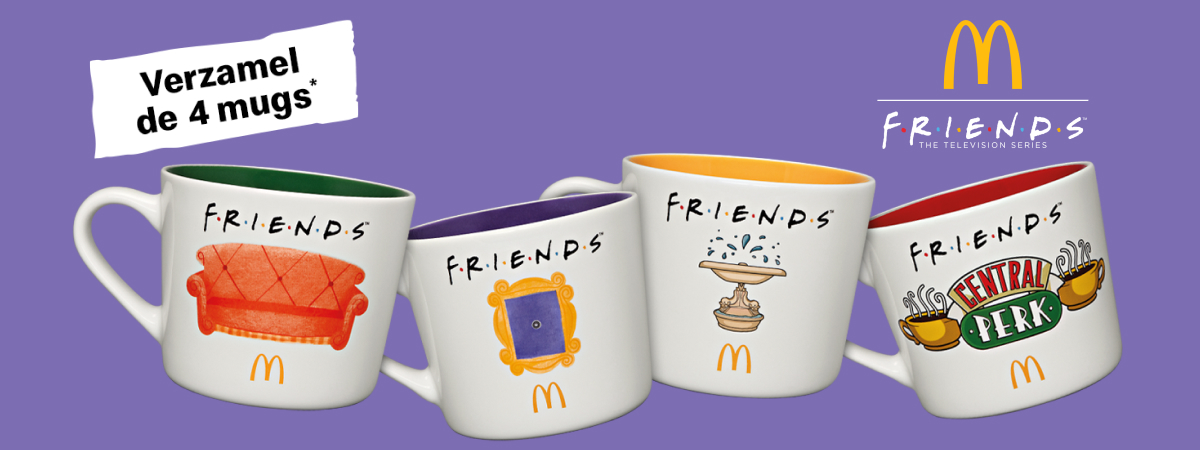 *Aanbod geldig van 10 februari 2026 t.e.m. 30 maart 2026, of zolang de voorraad strekt, in alle deelnemende (McDeliveryTM) restaurants in België. Per Friends Meal, bestaande uit een Large McMenu®, krijg je een Friends-mug (willekeurig gekozen). Monica’s Marinara Sauce is niet inbegrepen in de Friends Meal.